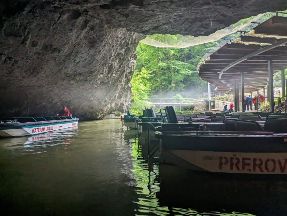 Und wieder geht’s in den Untergrund.Einsteigen zur Bootsfahrt.20 Minuten auf dem unterirdischen Fluss ‚Punkva‘ bis wir….… das Tageslicht wieder erreichen.Wer mal in der Gegend ist, sollte sich dieses Karsthöhlensystem nicht entgehen lassen! Anreise mit einer Seilbahn, die in die Schlucht führt oder wie wir. Kein direkter Zugang mit dem PKW.Vielen Dank an Margeta, die gut auf unsere Fahrräder aufgepasst hat.