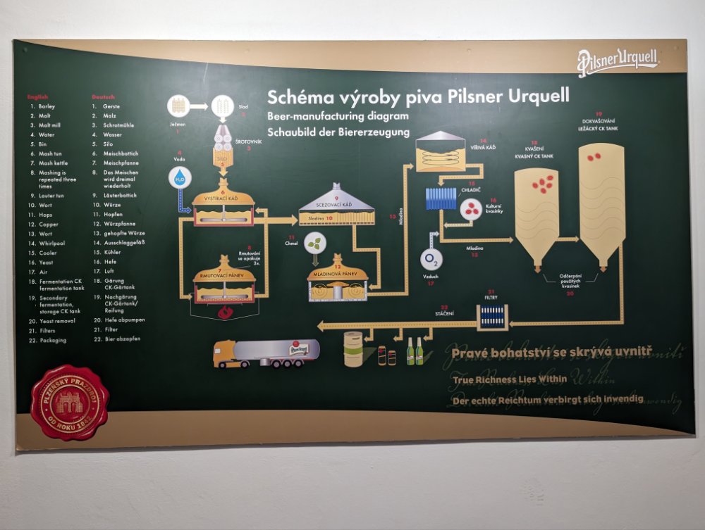 Stichworte aus der Führung 1839 gegründet, 1842 erstmals gebraut von dem bayerische Braumeister Josef Groll…Goldene Farbe. weißer Schaum. 80% aller hellen Biere werden heute weltweit nach dieser Art gebraut. Heute in japanischem Besitz. 60.000 Flaschen eine Anlage insges. 1 Mio l = 2 Mio Flaschen. 5 Wochen bis zum fertigen Bier. Gärkeller > Lagerkeller