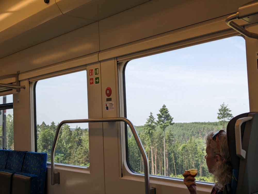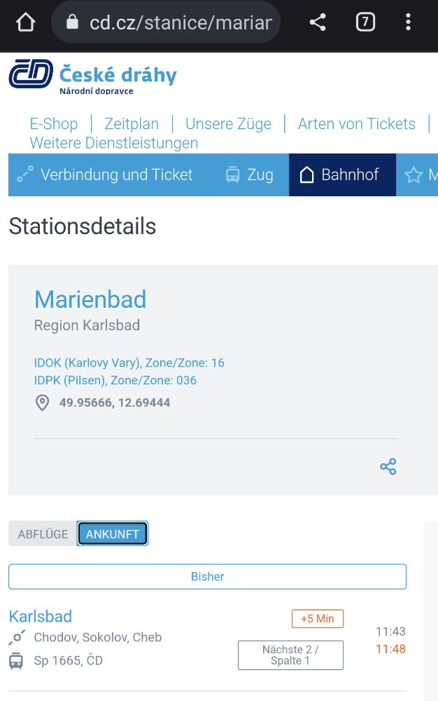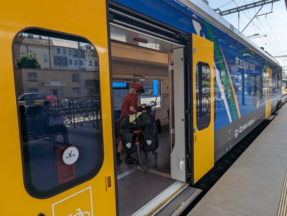 Buchungen über die Internetseite der tschechischen Bahn, České dráhy, sind möglich. Der Bahnhof in Pilsen ist eine Großbaustelle. Unser Regionalzug hat keine Gleisnummer (12 Gleise). Am Schalter können uns die Damen auch nur sagen, dass das erst kurz vorher bekanntgegeben wird und es ständig wechselt.Gestern hatten wir auf der Internetseite gesehen, dass es Gleis 3 war. So finden wir uns auf diesem Bahnsteig ein.Wir gehen davon aus, dass wenn dieser Zug durch ist, unser dort angezeigt wird. Aber nichts passiert, die Anzeige bleibt schwarz. 14 Minuten vor der planmäßigen Abfahrt dann die Erlösung über die Internetseite: Heute auf Gleis 11, also ganz andere Ecke.Alle Fahrstühle funktionieren 👍und sind frei. So erreichen wir früh genug unseren Zug……und finden auch noch Platz für unsere schwerbepackten Fahrräder.Gutes WLAN in diesem RegionalzugDie Onlineauskunft während der Fahrt funktioniert tadellos.