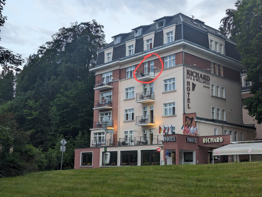 Pünktlich kommen wir an. 👋👋 3,5 km bis ins Zentrum. Unsere erste Anlaufstelle: Kolonáda Maxima GorkéhoDa staunen die Beiden. Unsere Fahrräder plädieren für einen Kuraufenthalt.Die beiden Maskottchen sind gleicher Meinung. Google MapsUnser Balkon mit ….…Blick auf die Orthodoxe Kirche St. Wladimir.