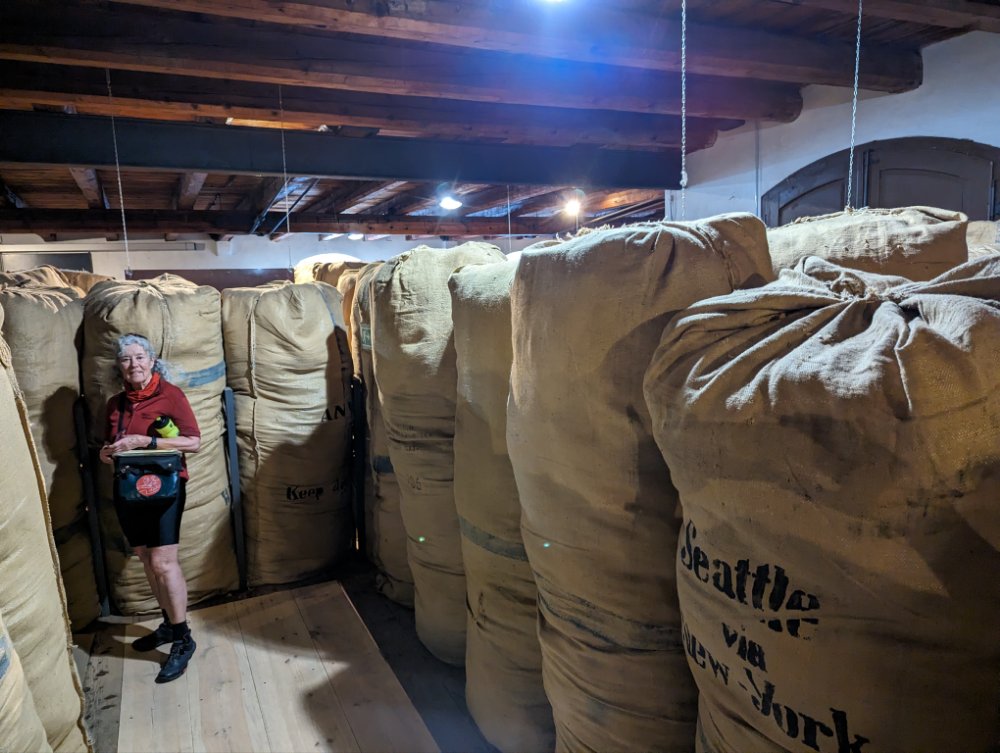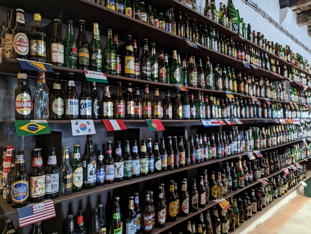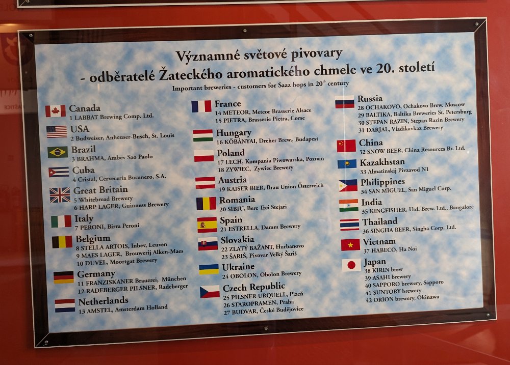Unten: die Anderen in die Hölle.Ein Labyrinth aus Hopfensäcken.Länder, die mit dem hiesigen Hopfen beliefert werden.Die internationale Flaschensammlung dazu (für Deutschland gibt’s ein seperates Regal). Irre, wie oft Ludwig schon in fernen Ländern Bier aus Saazer Hopfen genossen hat.Die Gemeinden, die Hopfen anbauen. Der Finger zeigt auf Želeč (dt. Seltsch). Viele Grüße an Wolfgang.Da könnte Deine Mutter dabei gewesen sein.Oder war sie das sogar als junge Frau? (Mit 19 Jahren wurde sie mit ihren Eltern als Sudetendeutsche enteignet und aus Böhmen vertrieben). Die Biere der Welt. Nach Pilsener-Brauart grün gekennzeichnet.Der Aussichtsturm gehört auch zur Museumsführung. Auf der Fahrt nach oben werden wir mit einem 3D-Flug über Saaz unterhalten.Die Grundschule.Alle Biersorten sind beschrieben. EMP=Platowert für Stammwürzgehalt als Grad angegeben ist der Zuckergehalt der Würze IBU=Bitterkeit ALK=Alkoholgehalt CENA= Preis. 0,5 l 2,- € und weniger.