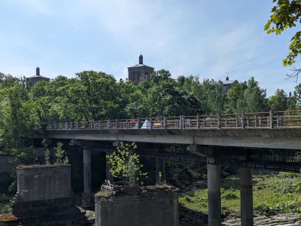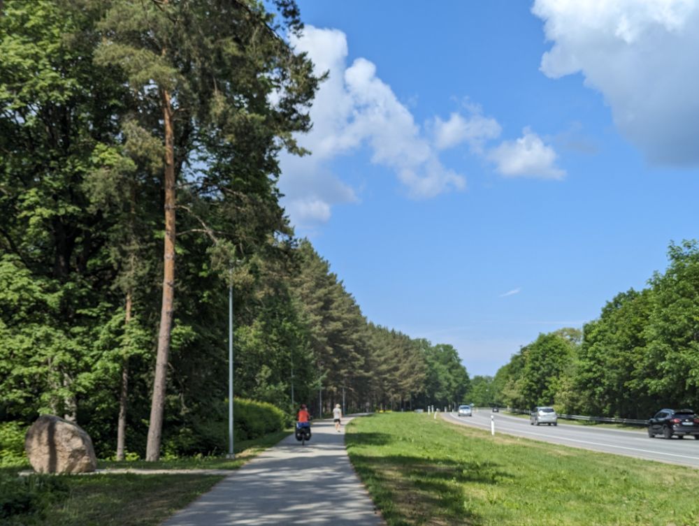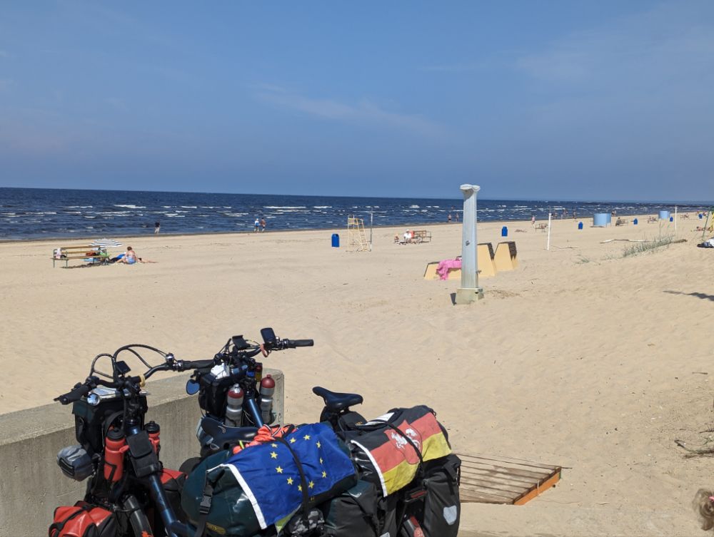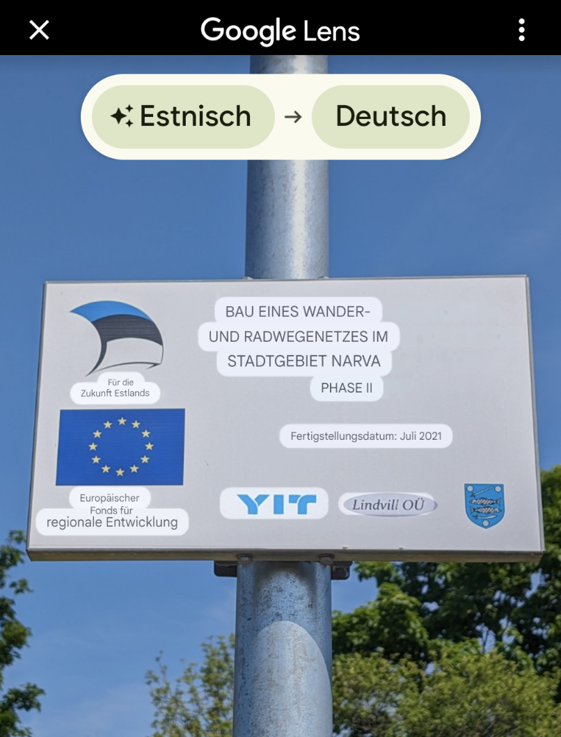 Kreenholm-Gebiet und Kreenholm-Textilfabrik liegt auf einer Insel der Narva, die heute nicht mehr passierbar ist.Am Ufer wurde im 19. Jahrhundert die berühmte Textilfabrik Kreenholm errichtet, die damals die größte Fabrik des Russischen Reiches war. 1913 arbeiteten dort über zehntausend Menschen!Um die Fabrik herum entstand ein kompakter Komplex industrieller Architektur, der die Fabrik, ein Krankenhaus, Arbeiterbaracken, Direktorenhäuser und den Kreenholm-Park umfasste. Die Gebäude wurden im englischen Stil aus rotem Backstein gebaut. Die Marke Kreenholm ist weit über Estland hinaus bekannt. Quelle: Visit Estonia Für Kerstin wird der Fahrweg gereinigt. Einfahrt auf die Narvainsel. Kein Zug überquert mehr die Brücke.Das russische Laufwasserkraftwerk.Angler jenseits… …und diesseits Kerstin verschwindet fast unter der mächtigen Festung.Die riesigen Flaggen von Europa, Estonia und Ukraine werden von unserer Deutschlandflagge untermalt und geben ein eindeutiges Signal an die andere Seite. Der Grenzübergang, heute von unten aus betrachtetet. Alle Metallkreuze wurden zerstört.Dank Europa …… kann uns Estonia…… diesen wunderbaren Radweg nach Narva-Jõesuu bieten.