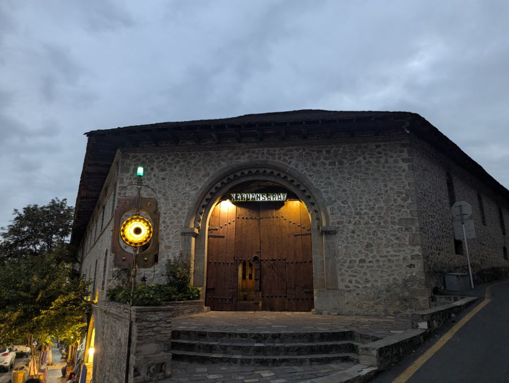 Eine Karawanserei war eine ummauerte Herberge an Karawanenstraßen. Reisende konnten dort mit ihren Tieren und Handelswaren sicher nächtigen und sich mit Lebensmitteln versorgen. Große Karawansereien (wie diese)dienten zugleich als Warenlager und Handelsplatz für Im- und Exportwaren. >>>Wikipedia