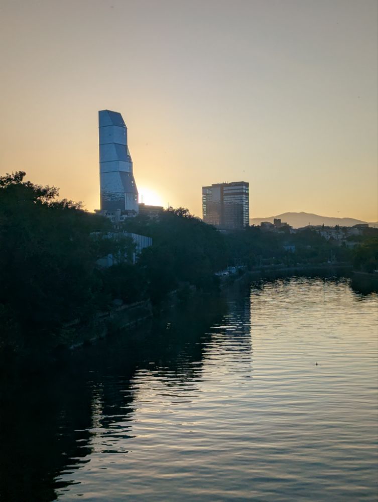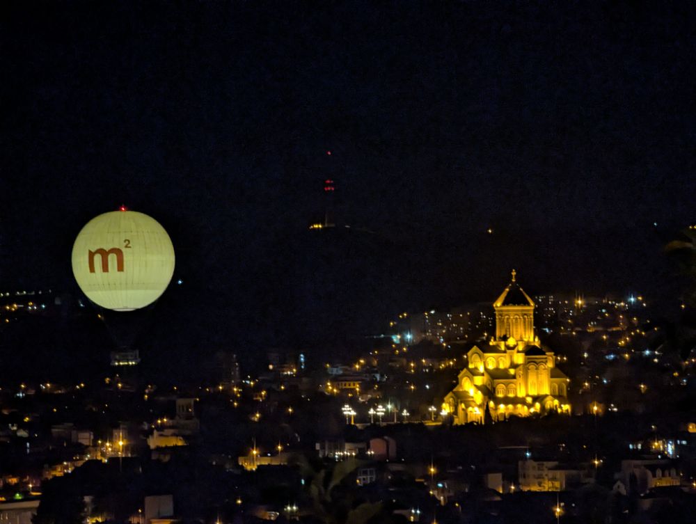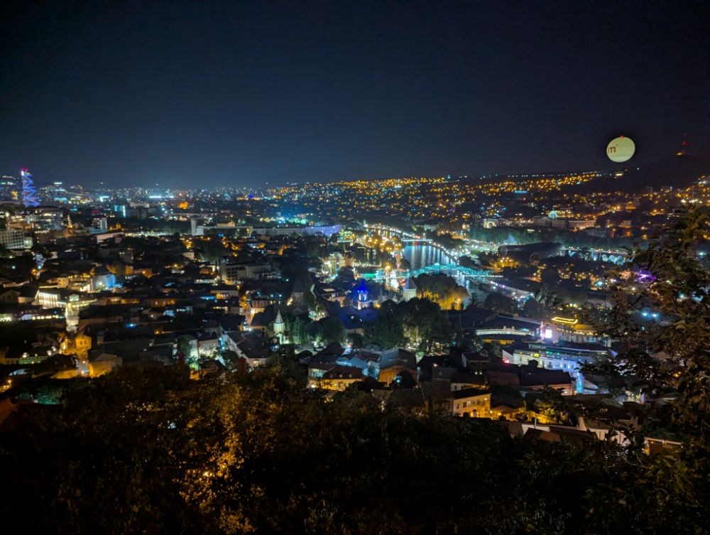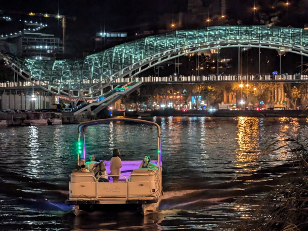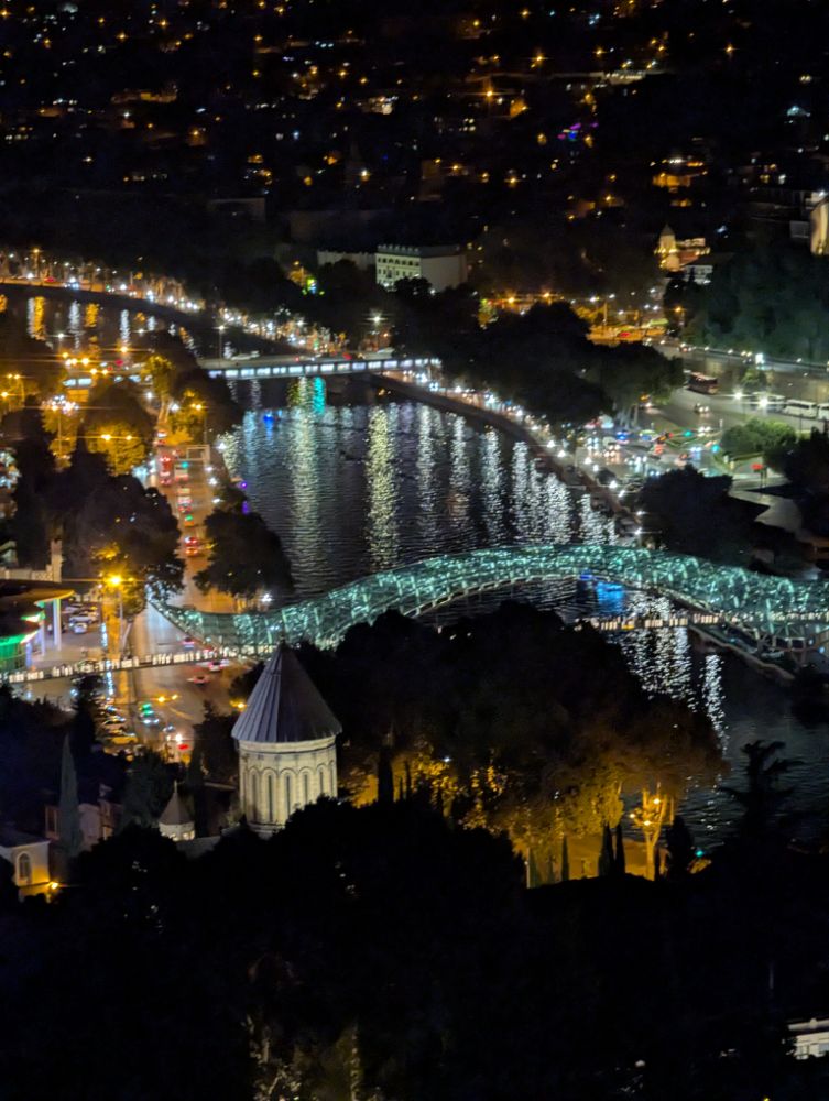 Die leuchtende Friedensbrücke, Bridge of Peace, beherrscht von höher gelegenen Standorten betrachtet die Szenerie in der Altstadt, bei Tag und vor allem auch in der Nacht.Diese bogenförmige Fußgängerbrücke besteht aus einer Glas-Stahlkonstruktion mit einem 150 Meter langen Haubendach aus Glas. Auf Georgisch heisst sie Mschwidobis Chidi.