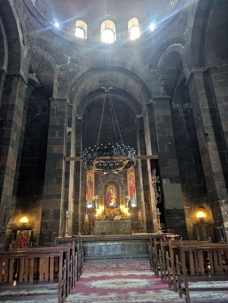 Sitz des Oberhauptes der Armenischen Kirche. Die Armenische Apostolische Kirche ist eine der ältesten Kirchen der christlichen Welt. Etschmiadsin nimmt einen besonderen Platz in der armenischen Geschichte ein. Seit Jahrhunderten werden hier die Rituale der armenischen Kirche durchgeführt. Wir bewundern Kirchen aus verschiedenen Epochen – von jahrhunderte alt bis ganz modern. (djoser)