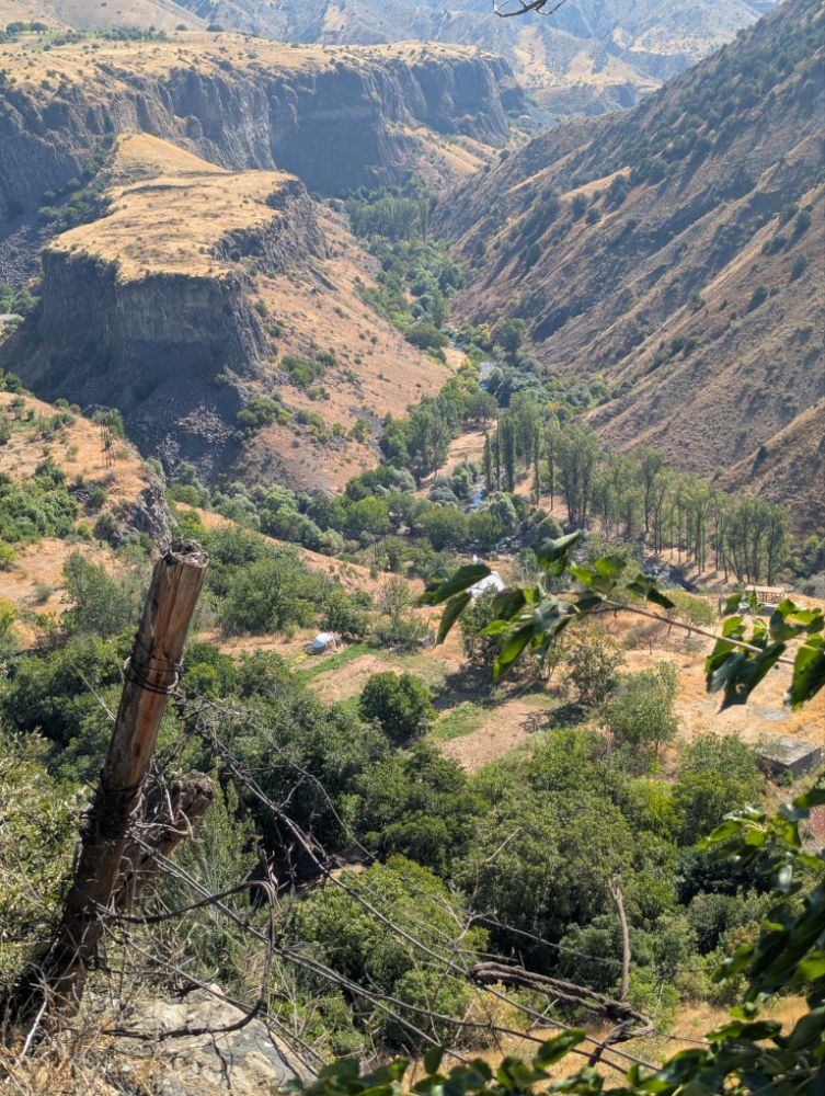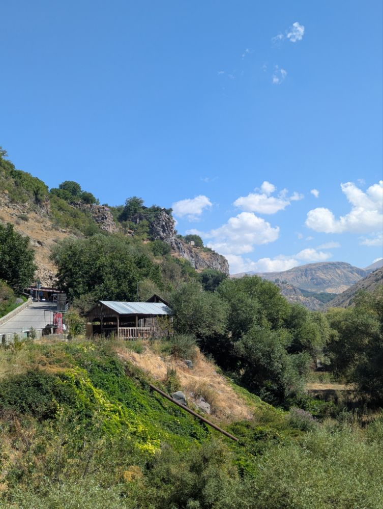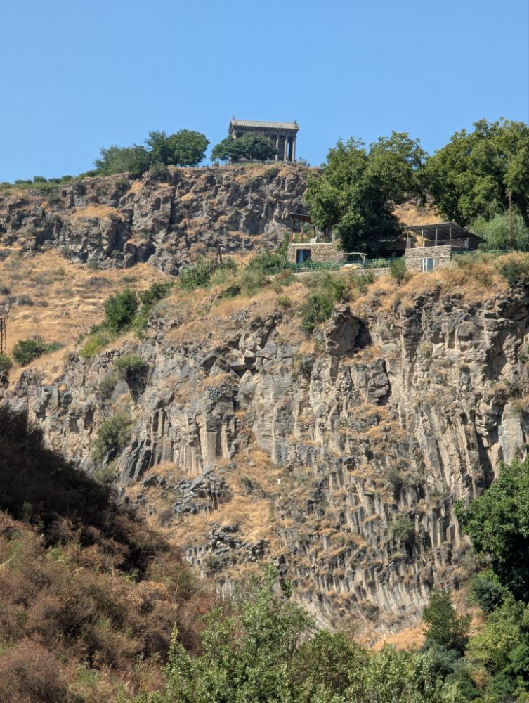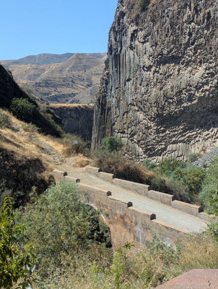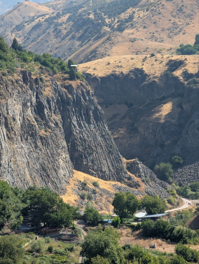 Unterhalb des Tempels von Garni liegt die Garni-Schlucht (oder Azat-Schlucht) am Fluss Azat. Diese beeindruckende Basaltschlucht ist bekannt für ihre spektakulären Basaltsäulen, die als „Symphonie der Steine“ bezeichnet werden und einzigartige geologische Formationen bilden.