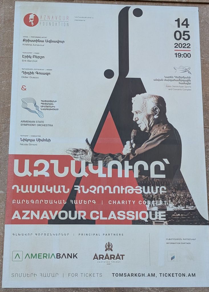 Das Bild zeigt ein Plakat für ein Wohltätigkeitskonzert mit dem Titel „AZNAVOUR CLASSIQUE“, das von der Aznavour Foundation präsentiert wurde anlässlich des 100. Geburtstags Charles Aznavours.