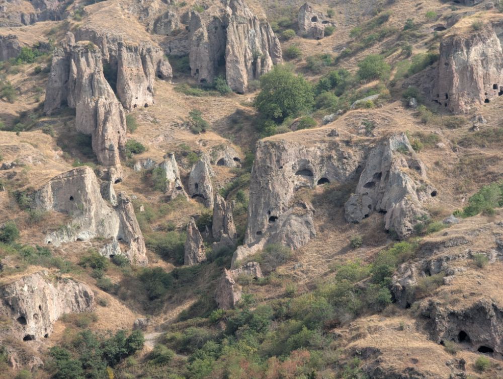 Der Höhlenkomplex von Khndzoresk, auch als „Altes Khndzoresk“ bekannt, ist eine faszinierende verlassene Höhlensiedlung im Süden Armeniens