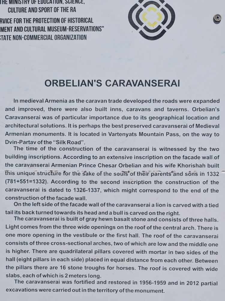 Im mittelalterlichen Armenien wurden mit der Entwicklung des Karawanenhandels die Straßen ausgebaut und verbessert. Es entstanden auch Gasthäuser, Karawanen und Tavernen. Orbelians Karawanserei war aufgrund ihrer geografischen Lage und ihrer architektonischen Lösungen von besonderer Bedeutung. Sie ist möglicherweise die am besten erhaltene Karawanserei unter den mittelalterlichen armenischen Denkmälern. Sie befindet sich am Vartenyats-Gebirgspass auf dem Weg nach Dvin-Partav an der Seidenstraße.