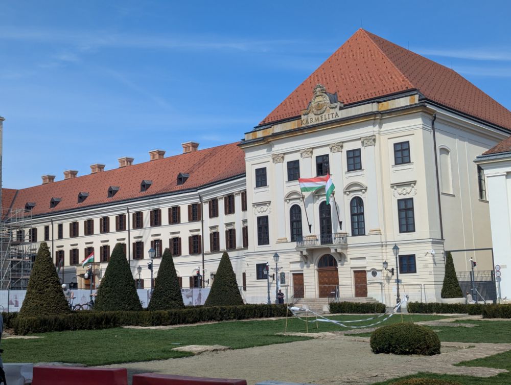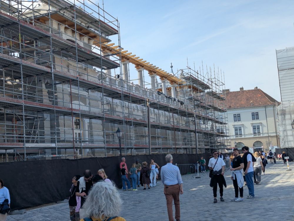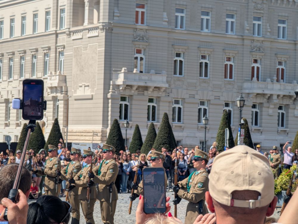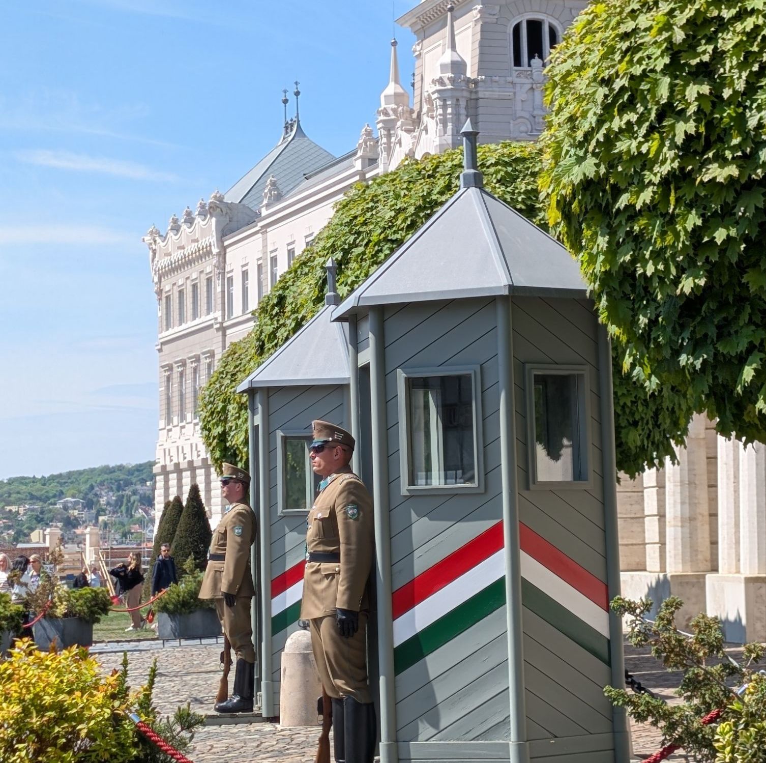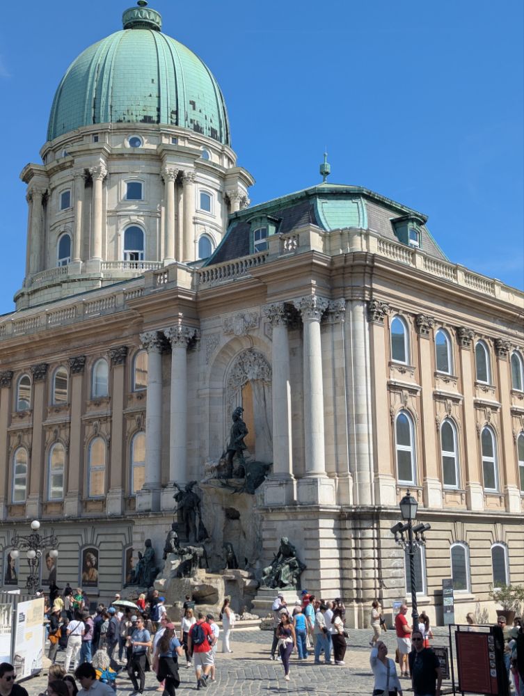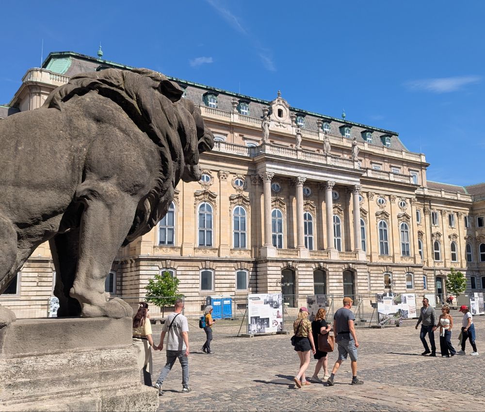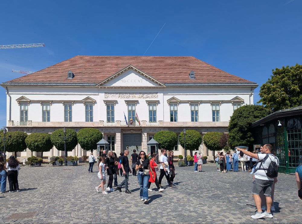 Die Jungs stehen vorm Palais Sándor (1806) im Burgviertel…