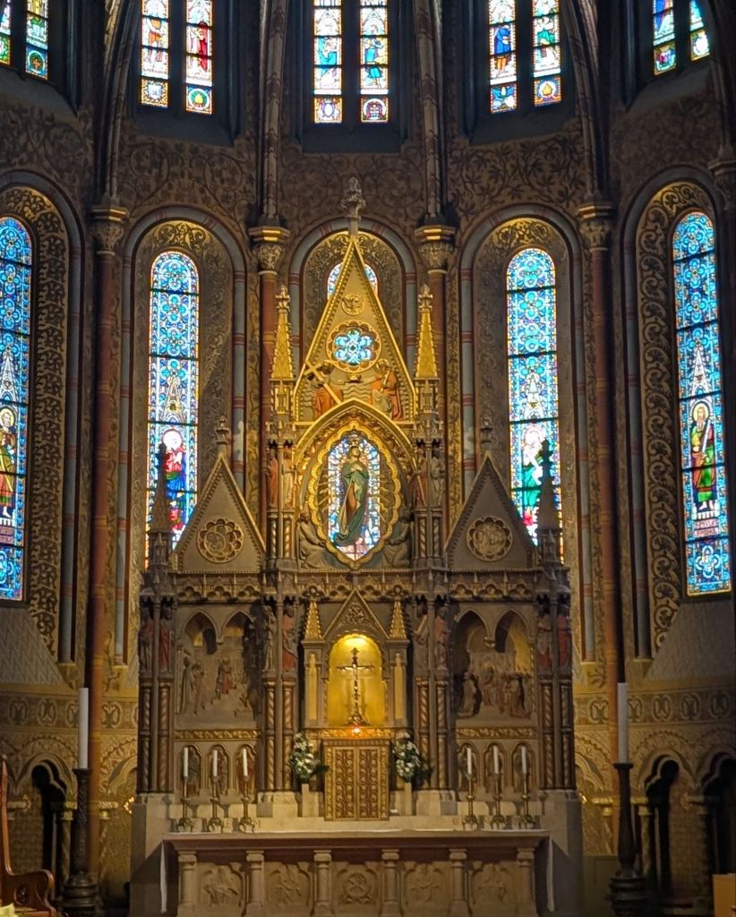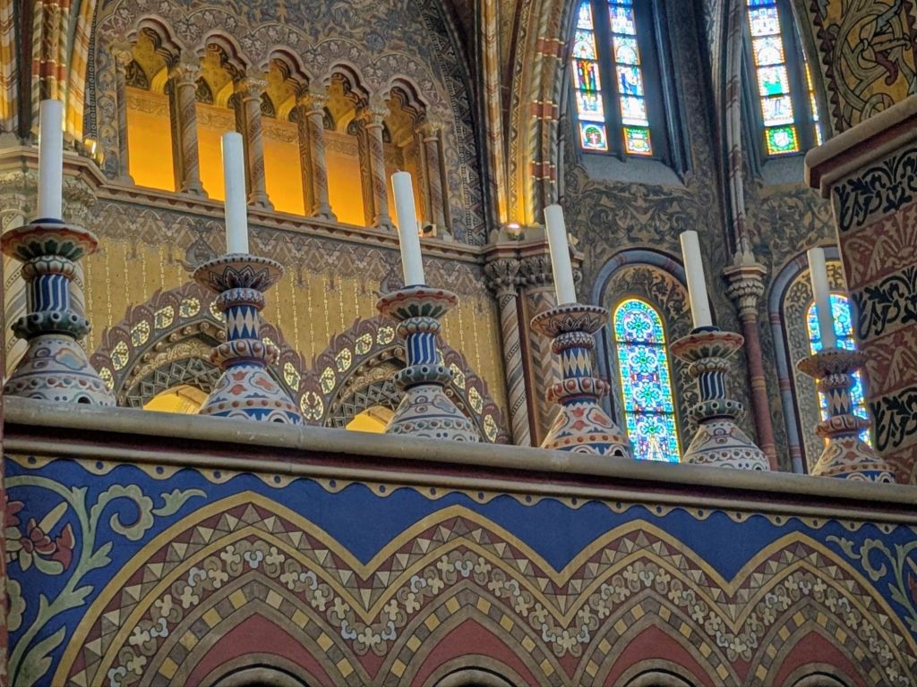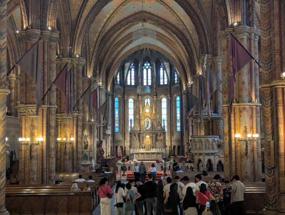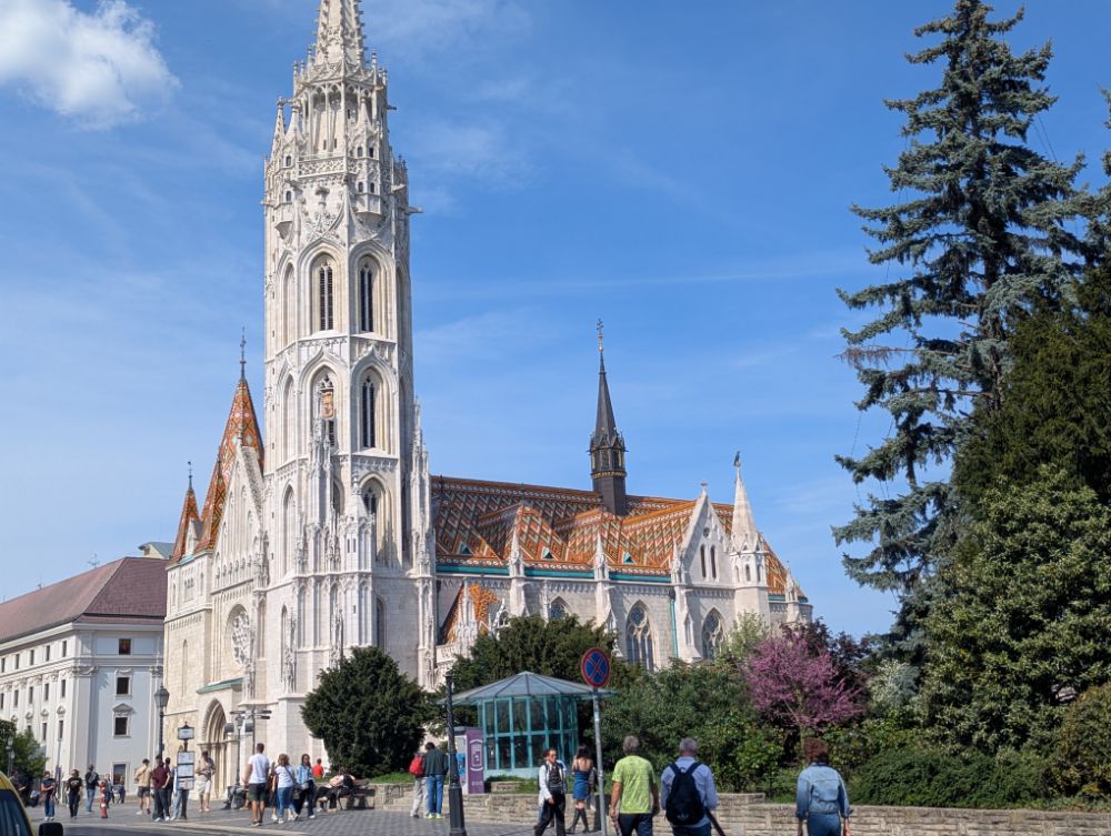 Eine Dachlandschaft aus bunten Ziegeln deckt den Mátyás templom, die Krönungskirche der ungarischen Könige. Vom 13. bis 15. Jh. erlebte das Gotteshaus viele Umbauten und diente im 16. Jh. sogar als Moschee. Von der hochgotischen Hallenkirche zeugt noch das Giebelrelief mit der Darstellung des >Marientodes< im westlichen Südportal. Die Kirche wurde Ende des 19. Jh. neogotisch umgestaltet. Aus dieser Zeit stammen der filigrane Südturm, das östliche der beiden Südportale, der Hochaltar, die bunten Glasfenster und die ornamentale Ausmalung.