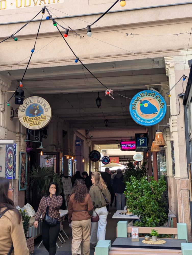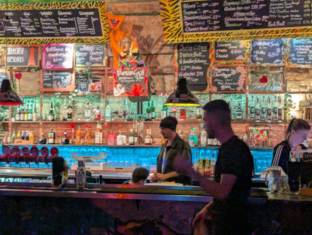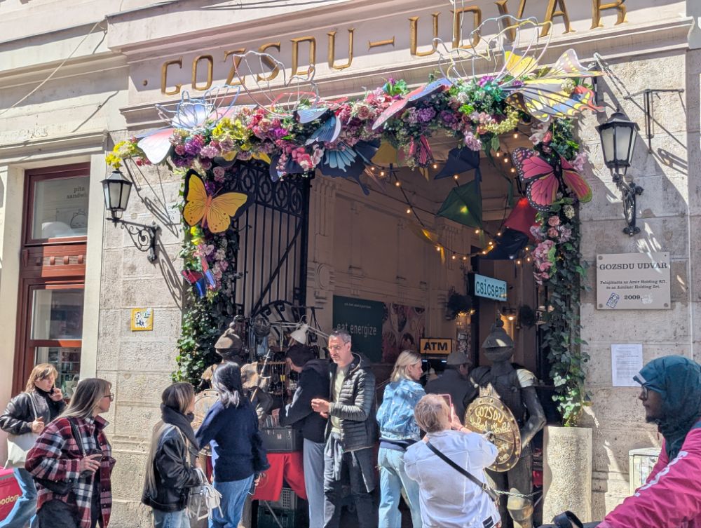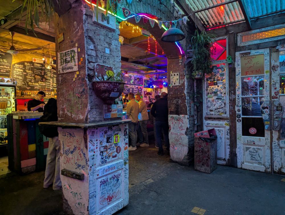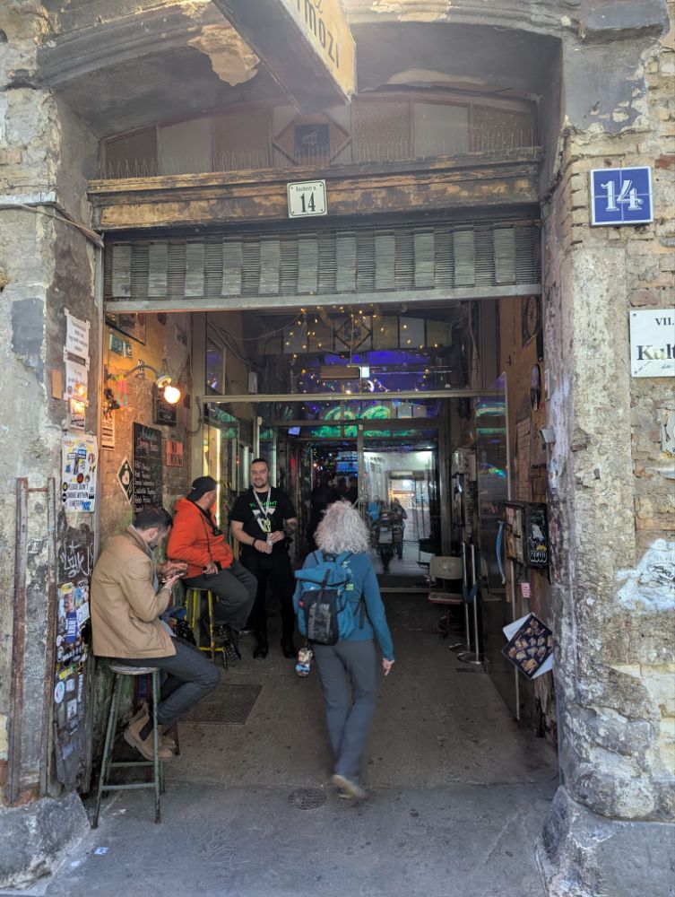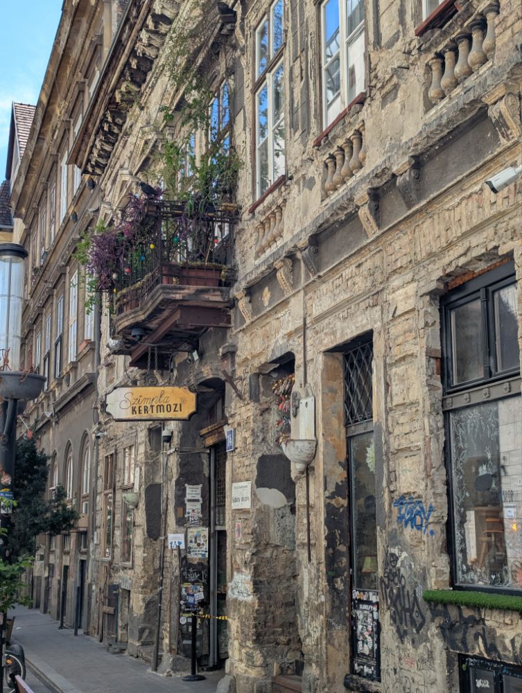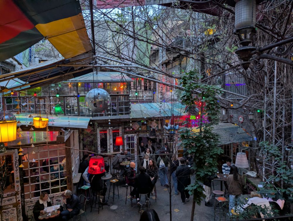 Das Szimpla Kert im 7. Bezirk von Budapest ist die bekannteste und erste Ruinenbar der Stadt, eröffnet 2002. Es ist ein surrealer, kreativer Ort in einem ehemaligen Fabrikgebäude, der durch kunterbunte Second-Hand-Möbel, Graffiti und skurrile Kunstinstallationen besticht.