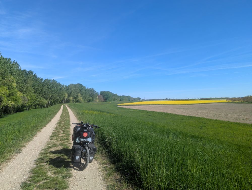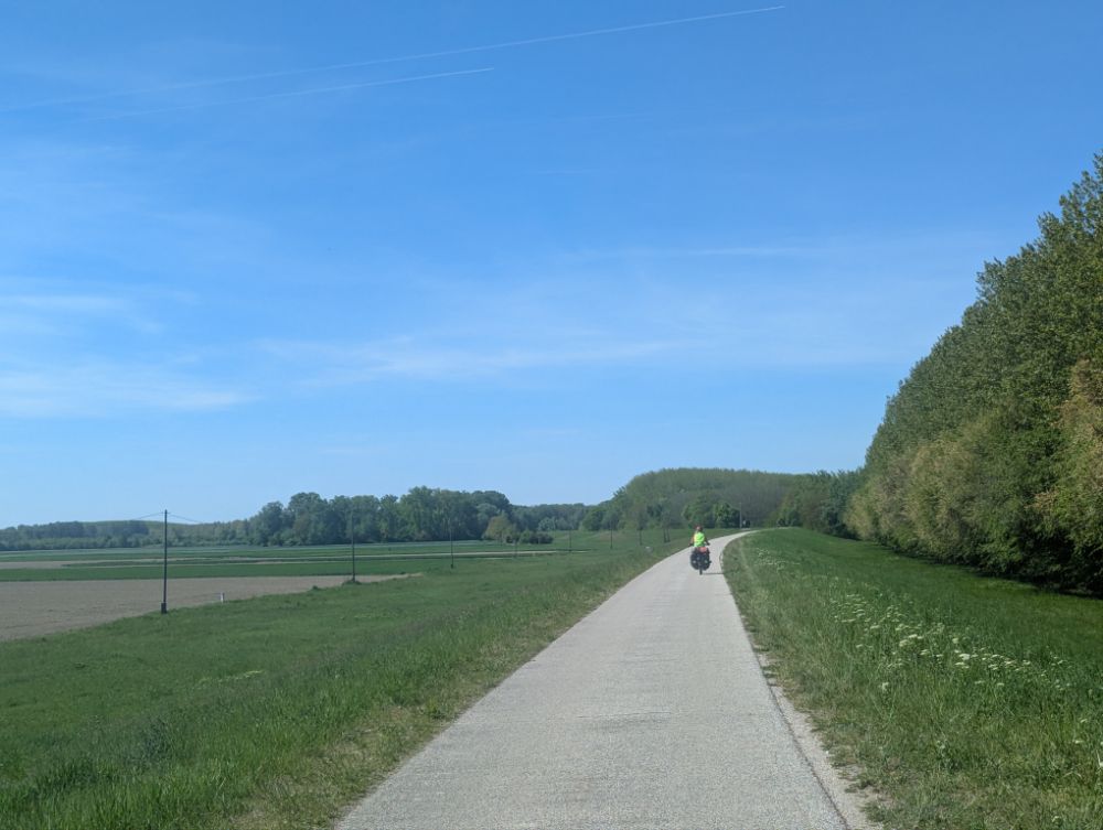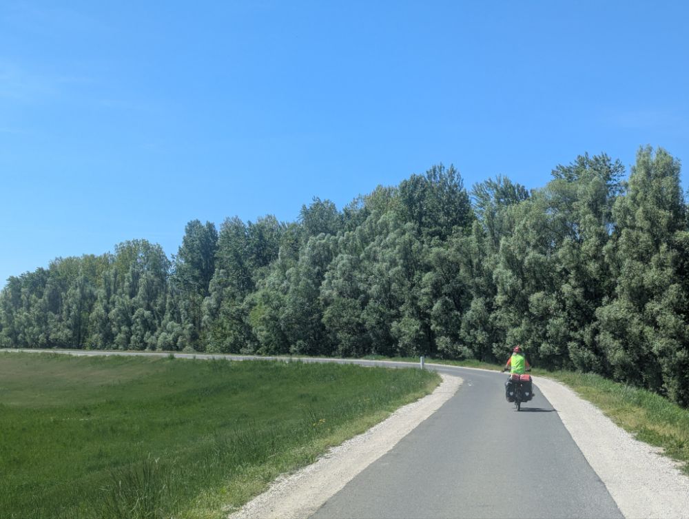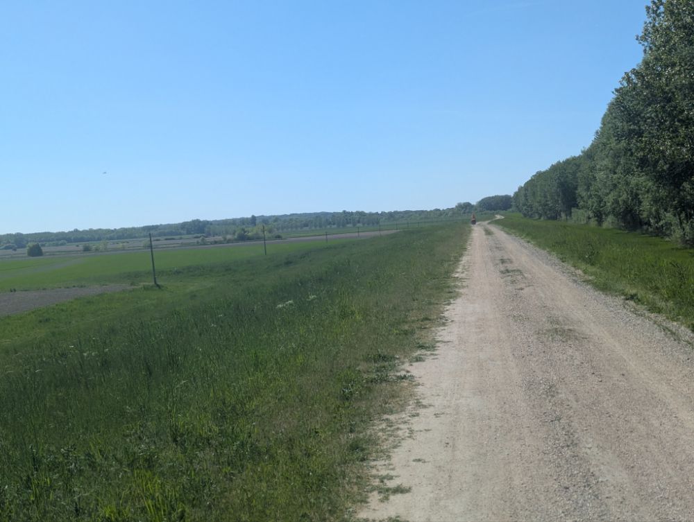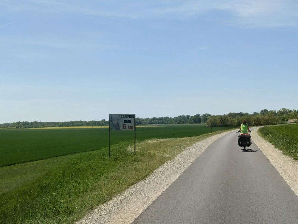 10 km KiesDann endlich fester Belag. Flaches Land mit.. .. intensiver landwirtschaftlicher Nutzung. Jetzt gibt’s auch Begegnungsverkehr.Familienausflug am Samstagvormittag. Unser erster Pausenstopp nach 35 km……mit Schiffsverkehr Immer mal wieder Radfahrer an diesem sonnigen und warmen Samstag. Noch 6 km bis Baja steht auf dem Schild