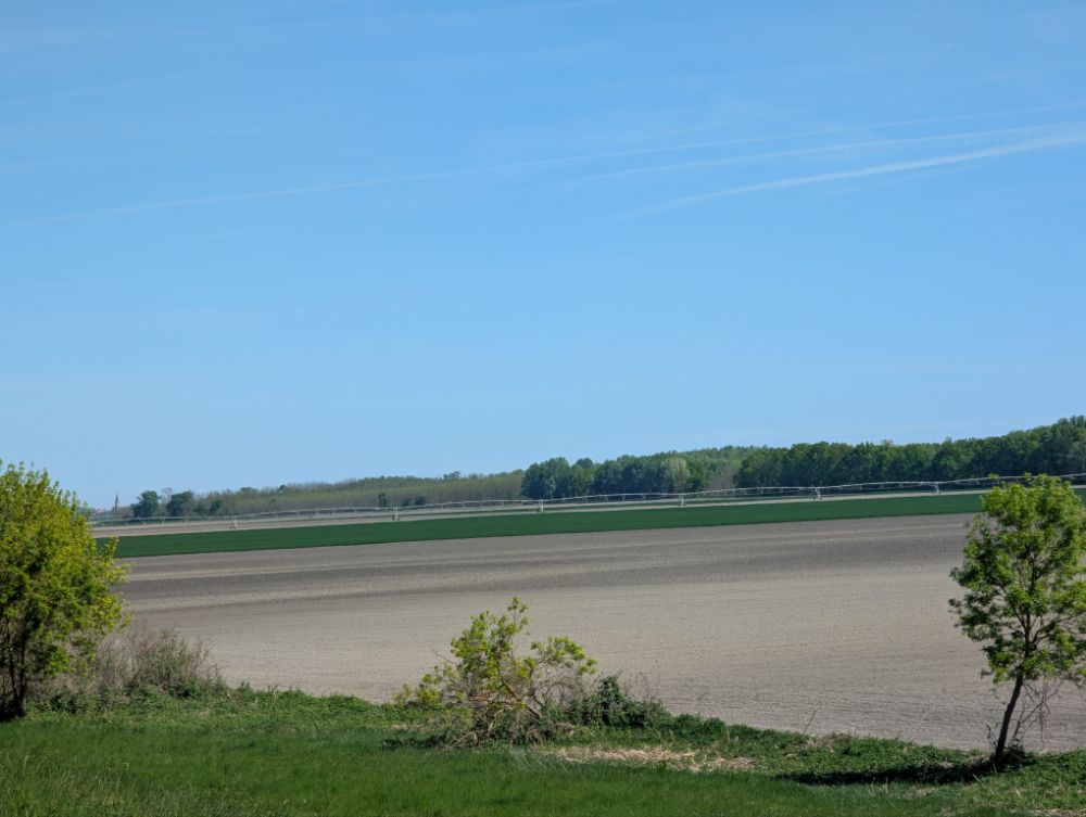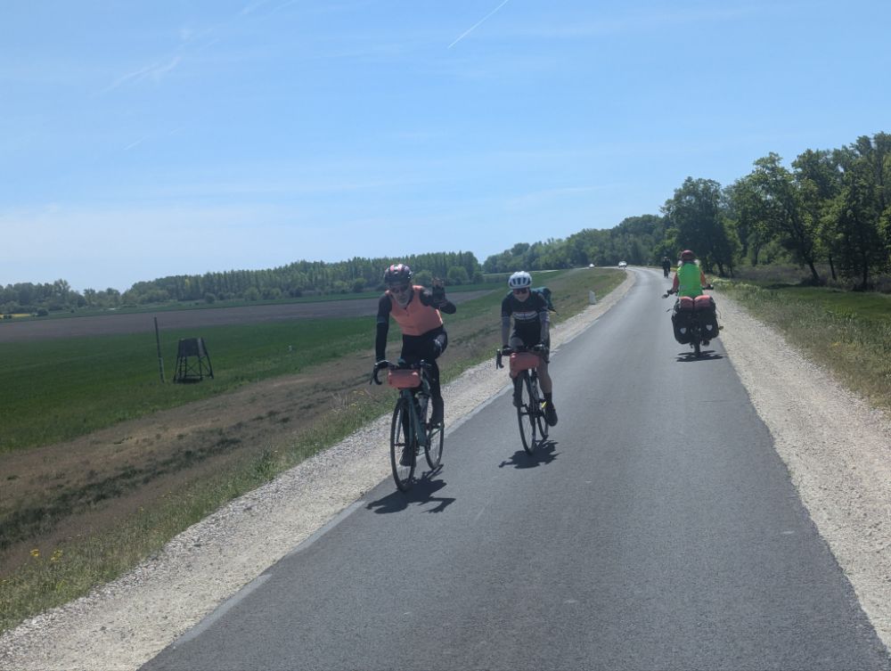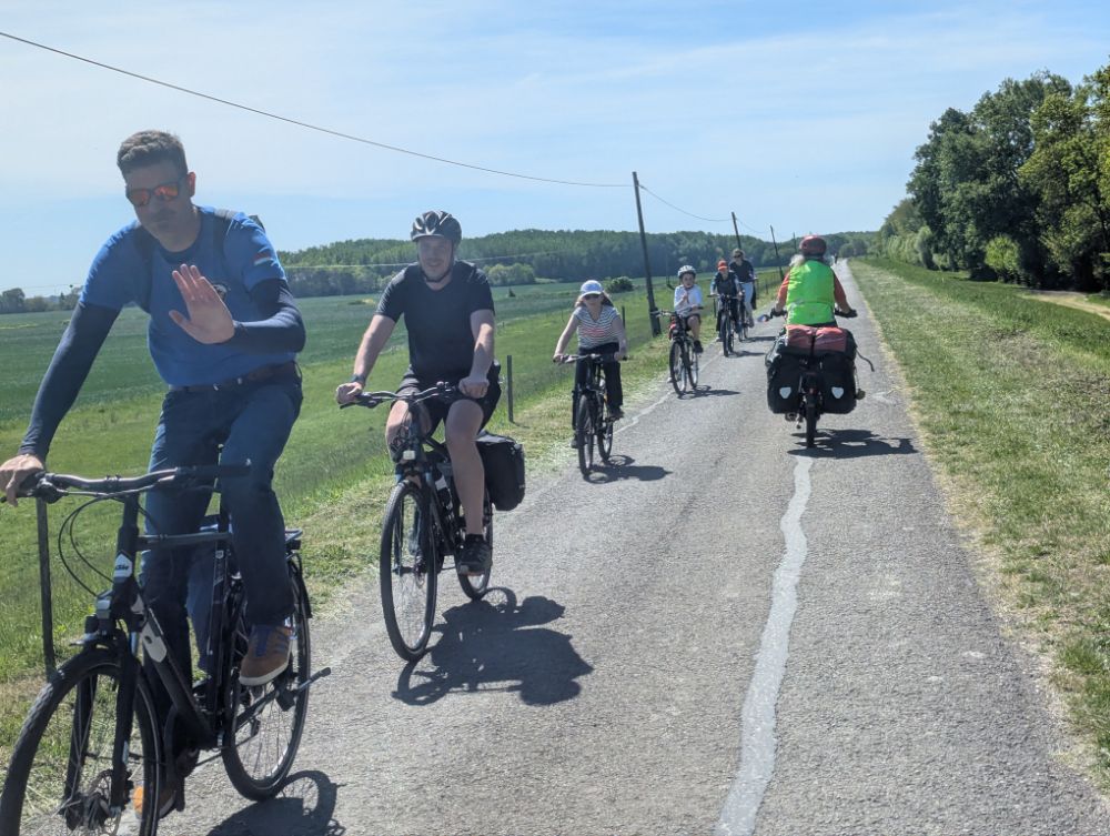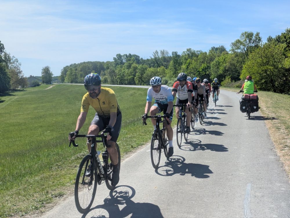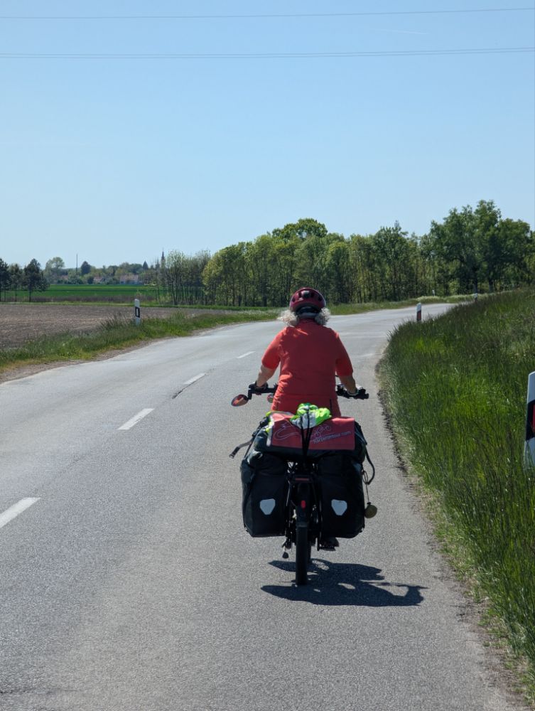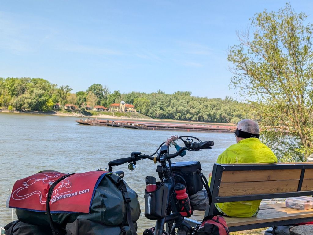 10 km KiesDann endlich fester Belag. Flaches Land mit.. .. intensiver landwirtschaftlicher Nutzung. Jetzt gibt’s auch Begegnungsverkehr.Familienausflug am Samstagvormittag. Unser erster Pausenstopp nach 35 km……mit Schiffsverkehr Immer mal wieder Radfahrer an diesem sonnigen und warmen Samstag. Noch 6 km bis Baja steht auf dem Schild