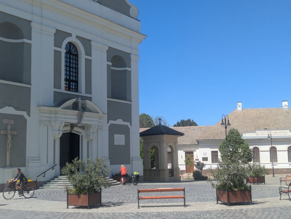 Hier könnte es ihn geben, … original Langosch im Straßenverkauf. Das muss einfach sein, bevor wir morgen Ungarn verlassen. Sauercreme, Knoblauch u Käse als Belag, mehr braucht es nicht. Fußgängerzone. Pünktlich 13.00 schließen die Geschäfte am Samstag, bis auf Eisdiele und Café. Der Bau der heutigen Kirche von Baja wurde 1764 eingeweiht.Der Hauptaltar aus Marmor im Barockstil.