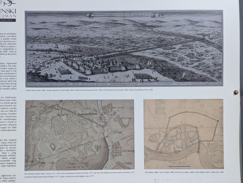 Von Osijek nach Darda, zwischen denen der Luftabstand etwas mehr als sechs Kilometer beträgt. Der Fluss wurde mit Pontons überbrückt, und vom linken Ufer der Drau bis zu Darda lag die Holzkonstruktion auf Säulen über dem sumpfigen Gelände